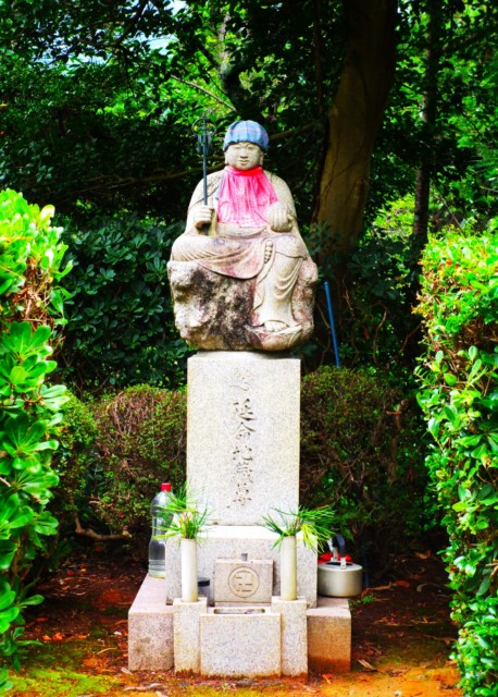 同公園・頂上広場の高台では。延命地蔵尊が神々しく、深緑からは「セミセミセミ」「ミーンミーンミーン」と蝉の声。間もなく「ツクツクボーシ ツクツクボーシ」と秋を迎えることに。