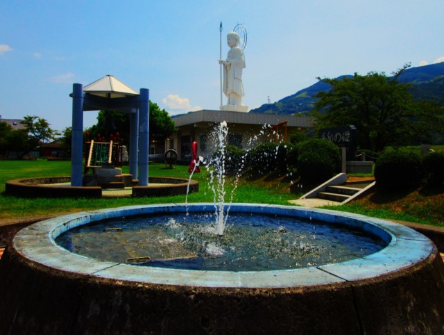 同公園は昭和31年(1956)、世界平和を希求する町民有志が平和祈念像建立を決意、洋画家で彫刻家の保田竜門(1891〜1965)原形デザインの地蔵菩薩像(高さ・約22メートル、コンクリート製)が完成した。