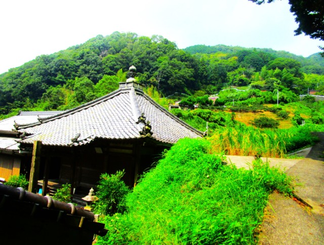 8月下旬の明王寺周辺は、あぜ道に囲まれた水田の稲穂が神々しく垂れて、涼風いただく稲穂波がまばゆい。柿畑の葉陰では、無数の青柿が生まれていて、枝葉が涼風を浴びると、無数の青柿も瑞々しさでいっぱい。