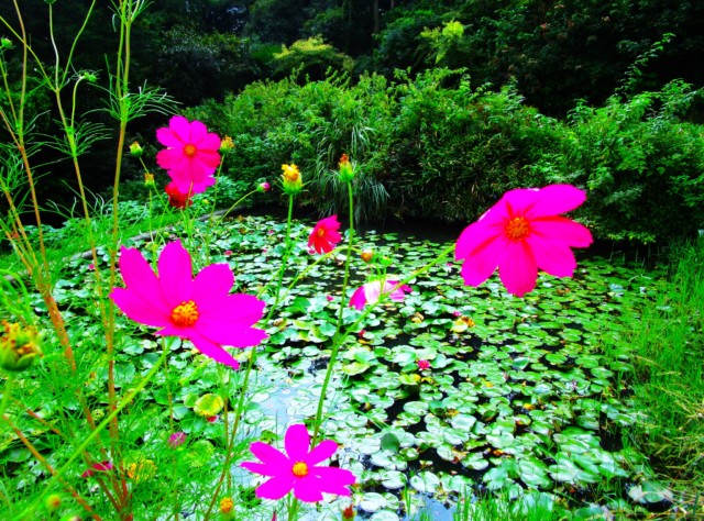 今秋も「真土万葉の里」のスイレン(睡蓮)池のほとりでコスモスが開花、瓦葺屋根の休憩所前の畦道などでは白い曼殊沙華がまばゆい。