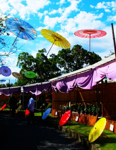 橋本市民菊の会・橋本市主催で、会員ら約10人が精魂込めて育てた大菊や懸崖(けんがい)、達磨(だるま)など約500鉢を展示。地上や中空には、色とりどりの和傘約100本を飾りつけ、フォトジェニックな空間があふれている。