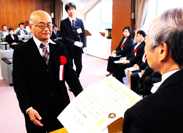 写真(上)は平木市長から文化賞を授与される岩倉さん。写真(中、下)は文化奨励賞を授与された鴇田さん。