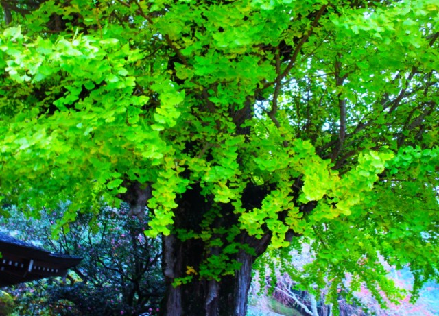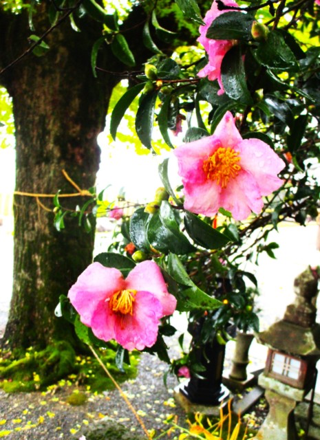 一方、堀越癪(しゃく)観音・境内の、山茶花の老樹(県指定の天然記念物)では、ピンク鮮やかに開花、隣りの大銀杏の巨樹もしっとり深緑、やがて黄葉深まることになる。