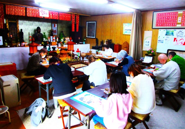 11月16日(日)、その仮本堂で「宝来飾紙作り」を開催。岩西住職は参加者と共に薬師如来坐像に合掌、般若心経を唱えた後、友人僧侶である四国霊場第四十番札所・観自在寺の三好温人(みよし・おんじん)師に描いてもらった「午の下絵」を配布。