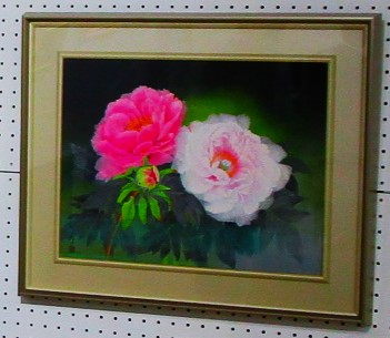 写真(上)は後藤さんの書「楽」(一字)と浦木さんの「楽」(五字)。写真(中、下)は南口さんの絵「富貴花」と鑑賞風景。