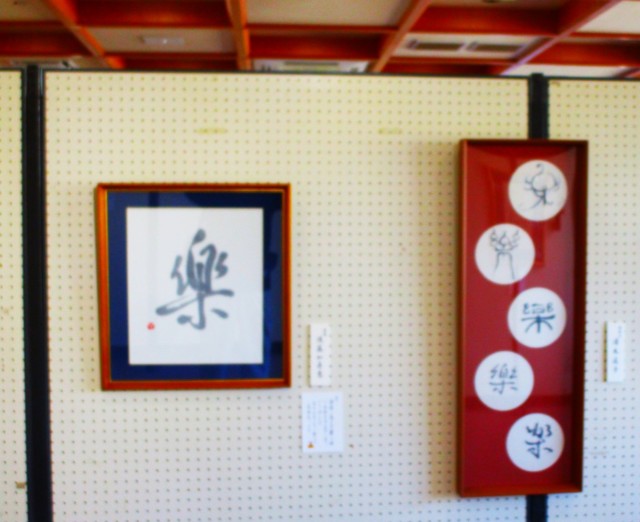 第33回水茎会書作展「楽」は後藤加寿恵(ごとうかずえ)さんの「楽」一文字や浦木逸子(うらき・いつこ)さんの絵のような「楽」五文字など約20人が各自数点ずつ出展。