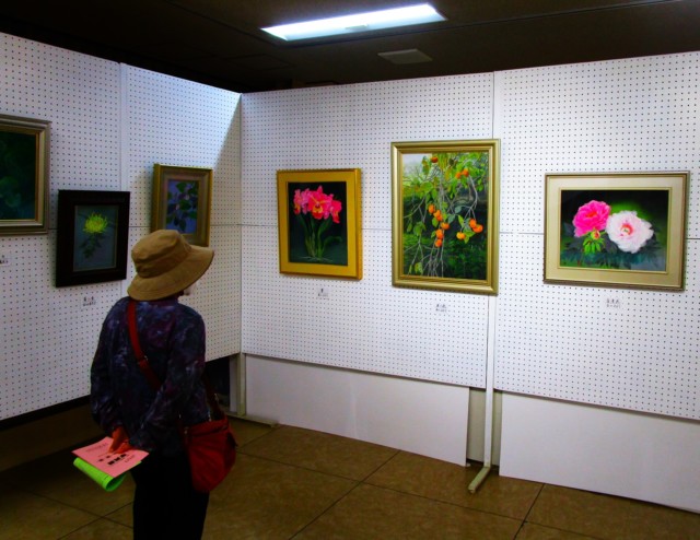 第8回「日本画 翠の会展」は、南口みどり代表が神々しい富貴花(ふうきか)や柿の実色づく里の秋を紹介するなど、小学生を含む約40人が数点ずつ出展。多くの家族連れらが、第51回「橋本フォトクラブ写真展」や水茎会書作展、日本画展にうっとり。書道家・後藤加寿恵さんや日本画家・南口みどりさんは「30日(日)もぜひ、お楽しみ下さい」と言っている。