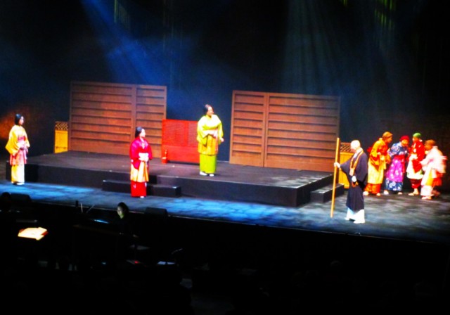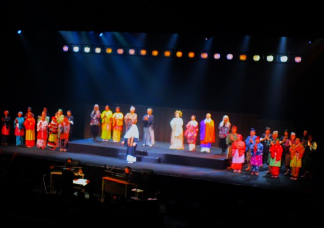 今回も唐谷裕子(からたに・ゆうこ)さん演出・脚本補筆、車川知寿子(くるまがわ・ちずこ)さん作曲で、お照役は十鳥可奈子(じゅうとり・かなこ)さん。僧侶の声明(しょうみょう)や女声合唱など、計約40人が練習に励み「お照の一灯」の素晴らしさを繰りひろげ、大勢の家族連れや友人グループは、涙を抑えなら防野さんや出演者に大拍手を贈っていた。