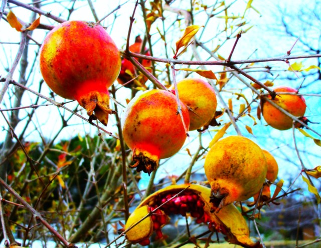 写真(上)は参道沿いで満開の椿と妙楽寺・鐘楼門を訪れた御参拝の人影。写真(中)は岩西住職の応援で鐘の緒を引き鳴らす可愛い子どもたち。写真(下)は境内の一角に輝く柘榴(ざくろ)の実。