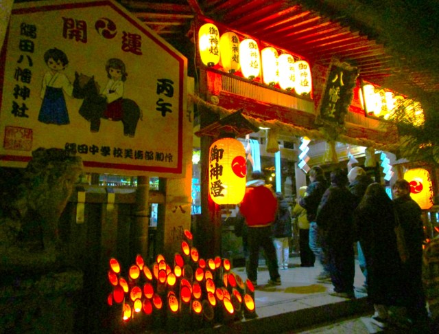 写真(上)は元旦の隅田八幡神社の拝殿風景。写真(中)は境内のどんど焼き。写真(下)は天井画「雲龍」のライトアップ。