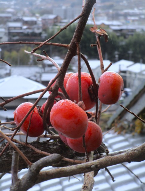 写真(上、中)は雪化粧した橋本駅周辺の市街地を往来する南海電車。写真(下)は高台にかがやく野鳥の愛する残し柿。