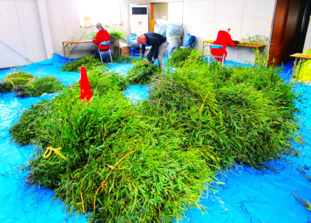 大弥工芸の作業員約40人は、高野山麓・伊都地方の竹藪で、孟宗(もうそう)新竹を伐採して、枝葉部分を倉庫に集荷。男女作業員が選定ハサミを使って、長さ1メートルに切りそろえ、枯れた枝葉や、形の悪い枝葉を除去。