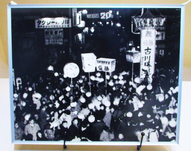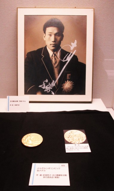 今回の記念展では、当時の古川さんの顔写真とオリンピック金メダル(複製)や、古川さんの金メダル獲得でJR・南海橋本駅前に「古川萬歳」看板や祝提灯などが飾られ、大勢の市民の歓喜満ちあふれる光景、さらに紀の川岸の高台から大の字になって飛び込む少女、それを見守る少年2人の姿など計10枚の写真を紹介。