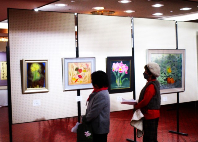 同展は会員約60人が絵画の部25点、書の部18点、写真の部9点、工芸の部8点、生け花の部15点を出展。いずれも個性豊かな作品ぞろい。