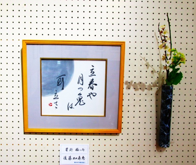 すぐ後ろでは南口みどりさんの「華」や高橋佳子さんの「華やかな秋」などの絵が並び、近くの書の部では、後藤加寿恵(ごとう・かずえ)さんの「星野椿の句」や諏訪原恵子(すわはら・けいこ)さんの「山頭火の句」などを飾っている。