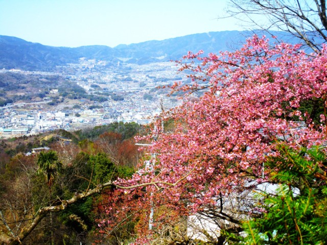 国城神社の参拝者や若いハイカーらは、満開の河津桜と紀の川流域の風景に静かに深呼吸。「家族や友人知己に見せたい」とスマホ撮影を楽しんていた。