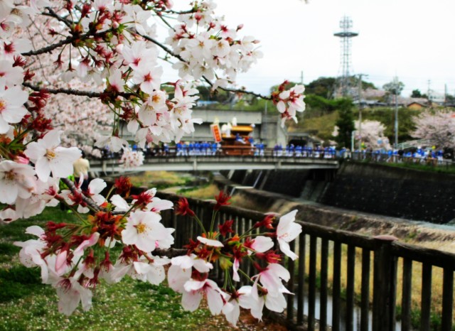 写真(上)は橋本川の松ヶ枝橋を渡る寺脇山車。写真(中)は同市東家の大和街道を鮮やかに進む寺脇山車。写真(下)は満開桜の彼方の古東橋を渡る東家地車風景。