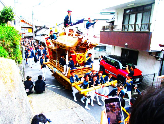 出発した東家地車と寺脇山車は橋本市役所前の国道から旧・高野街道を曳行。紀の川へ注ぐ橋本川の古東橋や、大和街道の松ヶ枝橋を渡り、旧高野街道との交差点を横断、笛・鉦・太鼓の音もあざやかに、ハッピ姿の若者たちが「そーりゃそーりゃ」と曳行。あたりはカメラ・スマホ撮影者が群がり、「これは例年の秋祭りと趣が異なり実に楽しい」とつぶやきながら、必死でシャッターを切っていた。